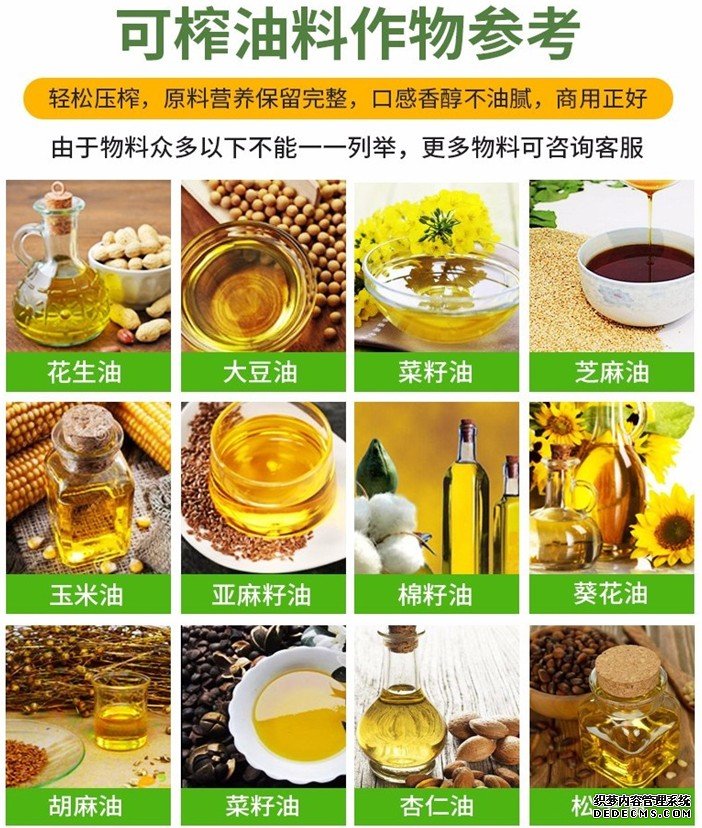 該設(shè)備可適用于菜籽、花生、茶籽、大豆、核桃、葵花籽等油料的生產(chǎn)加工,且壓榨出的油品綠色環(huán)保,對(duì)人體健康有益無(wú)害。購(gòu)買(mǎi)此機(jī)后可長(zhǎng)期穩(wěn)定作業(yè),對(duì)于中、小油廠(chǎng)和鄉(xiāng)鎮(zhèn)個(gè)體企業(yè)都很適用。